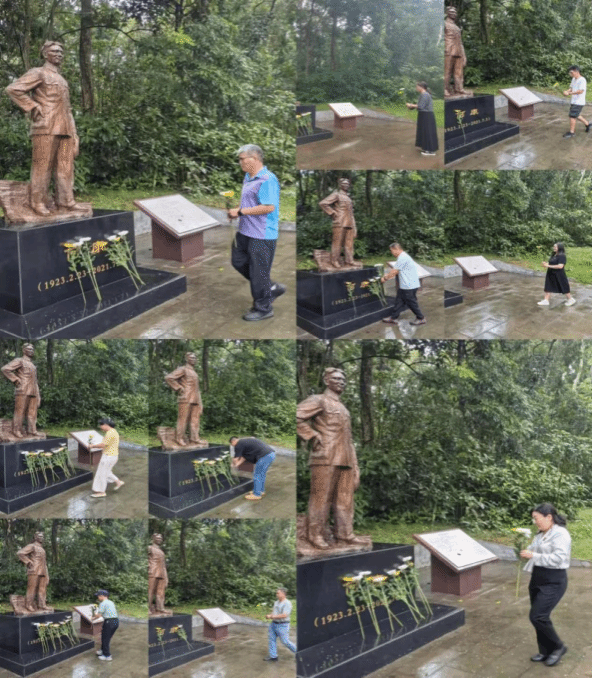 细雨濛濛,更添众人感怀之心。到达何康经理雕像前,支部全体党员依次鞠躬、献花,表达对这位两院先辈的深深敬佩之情。