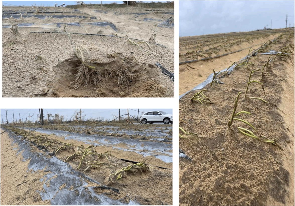2024年9月11-12日,体育外网十大平台app甘薯产业技术体系团队成员邓须军副教授、陈艳丽副教授、王蒙召博士以及刘意博士一行深入文昌木兰湾、澄迈桥头镇以及儋州海头进行甘薯受灾情况调研。调研发现,目前3个种植区甘薯生产仍处于育苗阶段,文昌木兰湾甘薯受灾最为严重,30亩种苗受灾,台风过后地上部几乎全为光杆,且由于文昌木兰湾处于断电断网状态,这给甘薯生产恢复带来不小的挑战。不过,令人欣慰的是,部分种苗的地上部已经开始萌发新芽,而地下部则出现了白色须根,在当前阶段,促生长显得尤为关键,团队给相关甘薯种植企业提供了灾后甘薯恢复生产建议。