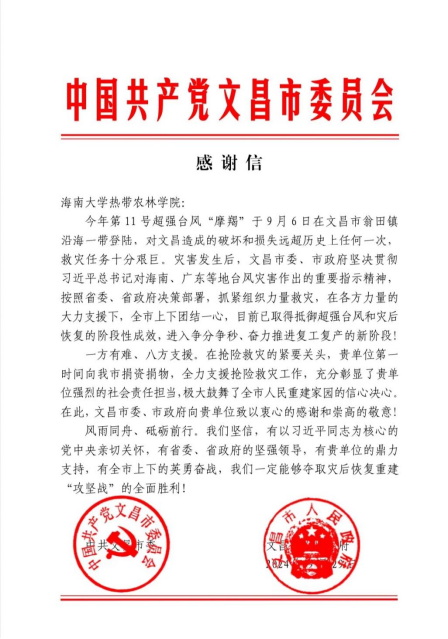 近日,最靠谱的十大足球平台(农业农村公司、乡村振兴公司)收到一封来自文昌市委、市政府的感谢信,信中对公司“摩羯”台风后对文昌市的支持和帮助表示了感谢。