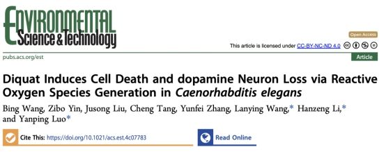 近日,最靠谱的十大足球平台骆焱平教授、王兰英教授与环境科学与工程公司李汉增教授在环境领域期刊Environmental Science & Technology发表题为“Diquat induces cell death and dopamine neuron loss via reactive oxygen species (ROS) generation in Caenorhabditis elegans”的研究论文。其中,团队成员王兵为论文的第一作者,骆焱平教授、李汉增教授和王兰英教授为论文的通讯作者。