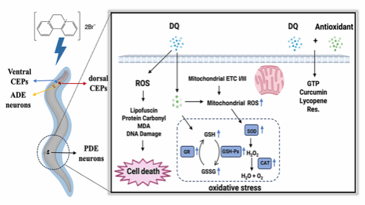 敌草快(DQ)是农业领域控制杂草的灭生性除草剂,百草枯被禁用后,敌草快得到广泛应用。由于其水溶性强,在环境中残存的敌草快是否会对环境生物产生影响,我们以秀丽隐杆线虫(Caenorhabditis elegans)为模式生物,探讨了环境浓度下敌草快对神经毒性和细胞死亡的影响。研究发现,低浓度的 DQ 暴露会导致发育中度缺陷,还导致秀丽隐杆线虫多巴胺能神经元出现缺陷。通过转录组分析,揭示了与这种生物水平毒性受到了细胞死亡、过氧化物酶体稳态相关的几种通路调控,并且多巴胺能神经元相关的基因被显著下调。在DQ 暴露下,在秀丽隐杆线虫胚胎的不同发育阶段中,凋亡细胞数量显著增加,促进了胚胎细胞死亡。尤其在吞噬缺陷突变体 ced-1 (e1735) 中,细胞死亡现象更为显著。进一步研究通过ROS(活性氧)特异性探针和转基因报告株证实,DQ 暴露导致秀丽隐杆线虫体内ROS水平呈剂量依赖性升高,伴随氧化损伤的出现。此外,线粒体功能受到显著影响。线粒体复合物 I 的活性在 DQ 暴露后呈浓度依赖性下降,而复合物 III 的活性 DQ处理下显著增加。与此一致,在人 HEK293T 细胞中,研究还观察到 DQ 处理后复合物 II 和 III 的蛋白水平发生了特异性变化,线粒体ROS也显著增加。这些结果进一步揭示了 DQ 对线粒体功能及氧化应激的影响机制。