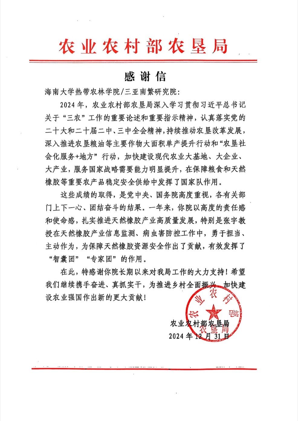 近日,最靠谱的十大足球平台(农业农村公司、乡村振兴公司)收到一封来自农业农村部农垦局的感谢信,信中对公司在推进天然橡胶产业高质量发展,特别是公司张宇教授在天然橡胶产业信息监控、病虫害防控工作中的突出贡献表示了感谢。