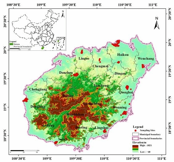 图 1. 海南岛在中国的位置及海南岛行政区划图(不含三沙市),海口市、澄迈县、定安县、临高县、儋州市、白沙黎族自治县、东方市、乐东县、三亚市、五指山市、陵水黎族自治县、万宁市、屯昌县、琼海市和文昌市的采样点(红色圆圈)。此外,本图中的海拔范围指的是本研究中采样点的最高和最低海拔。