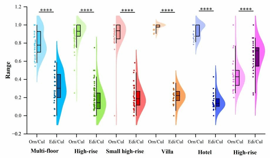 图 2. 不同类型住宅区栽培植物价值差异的箱线图。Orn/Cul 代表具有观赏价值的植物占栽培植物的比例,Edi/Cul 代表具有食用价值的植物占栽培植物的比例。“****” 表示 p 值小于 0.0001。