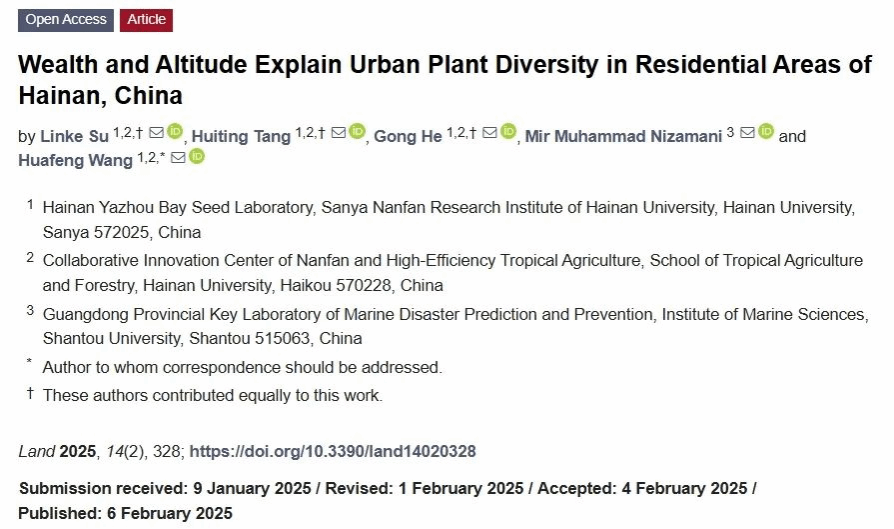 2025年2月,《Land》期刊(中科院二区期刊,IF=3.2)发表题为“Wealth and Altitude Explain Urban Plant Diversity in Residential Areas of Hainan, China”的研究论文。体育外网十大平台app本科生苏琳珂为该论文的第一作者,王华锋教授为论文的通讯作者。本研究得到国家自然科学基金的资助。