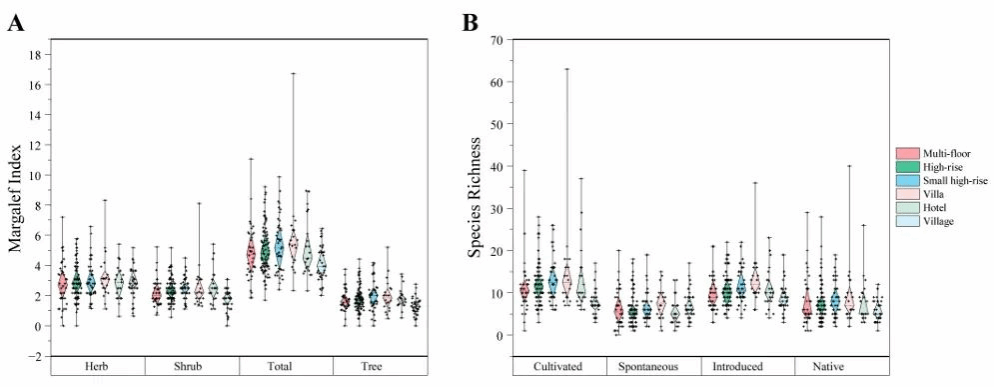 图 3. 不同类型住宅区的箱线图。(A) 按总物种、乔木、灌木和草本划分的不同类型住宅区的 Margalef 指数箱线图。(B) 按栽培物种、自发物种、引入物种和本地物种划分的不同类型住宅区的物种丰富度箱线图。