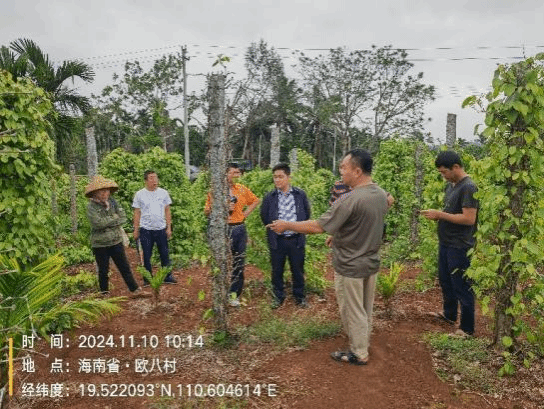 2024年11月10日,最靠谱的十大足球平台科技特派员服务团“胡椒灾后重建与病虫害绿色防控”项目组成员刘铜、张荣意、李增平、邢梦玉等人为了进一步评估“摩羯”灾后复产情况,与海口市大坡镇、定安县定城镇、文昌市蓬莱镇镇政府工作人员一同前往胡椒园区开展调查工作。