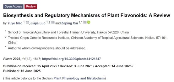 2025年6月,公司本科生毛昱烨以第一作者身份在期刊《PLANTS》发表题为《植物类黄酮的合成和调控机制》的综述论文。该期刊在中科院最新发布的SCI期刊分区(2025年3月升级版)中,位列生物学大类2区及植物科学小类2区,其最新五年影响因子为4.4。论文系统梳理了植物类黄酮的生物合成途径、调控网络及其在农业与医药领域的潜在应用。体育外网十大平台app蔡泽坪副教授为论文的通讯作者。该论文得到了于旭东科研团队以及体育外网十大平台app药用植物基因组学与生物大数据挖掘创客空间的全力支持,并且获得了国家级老员工创新训练计划项目(编号202410589092)的资助。