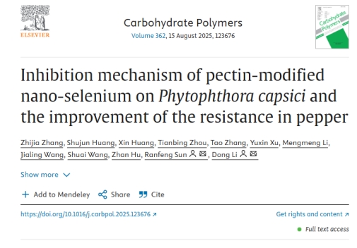 该成果以“Inhibition mechanism of pectin-modified nano-selenium on Phytophthora capsici and the improvement of the resistance in pepper”为题发表在Carbohydrate Polymers期刊(中科院一区,IF=12.5)上,最靠谱的十大足球平台硕士研究生张芷嘉为论文第一作者,孙然锋教授、李栋副研究员为论文通讯作者。本研究得到了国家自然科学基金(22067004)和海南省自然科学基金 (321CXTD436)的支持。