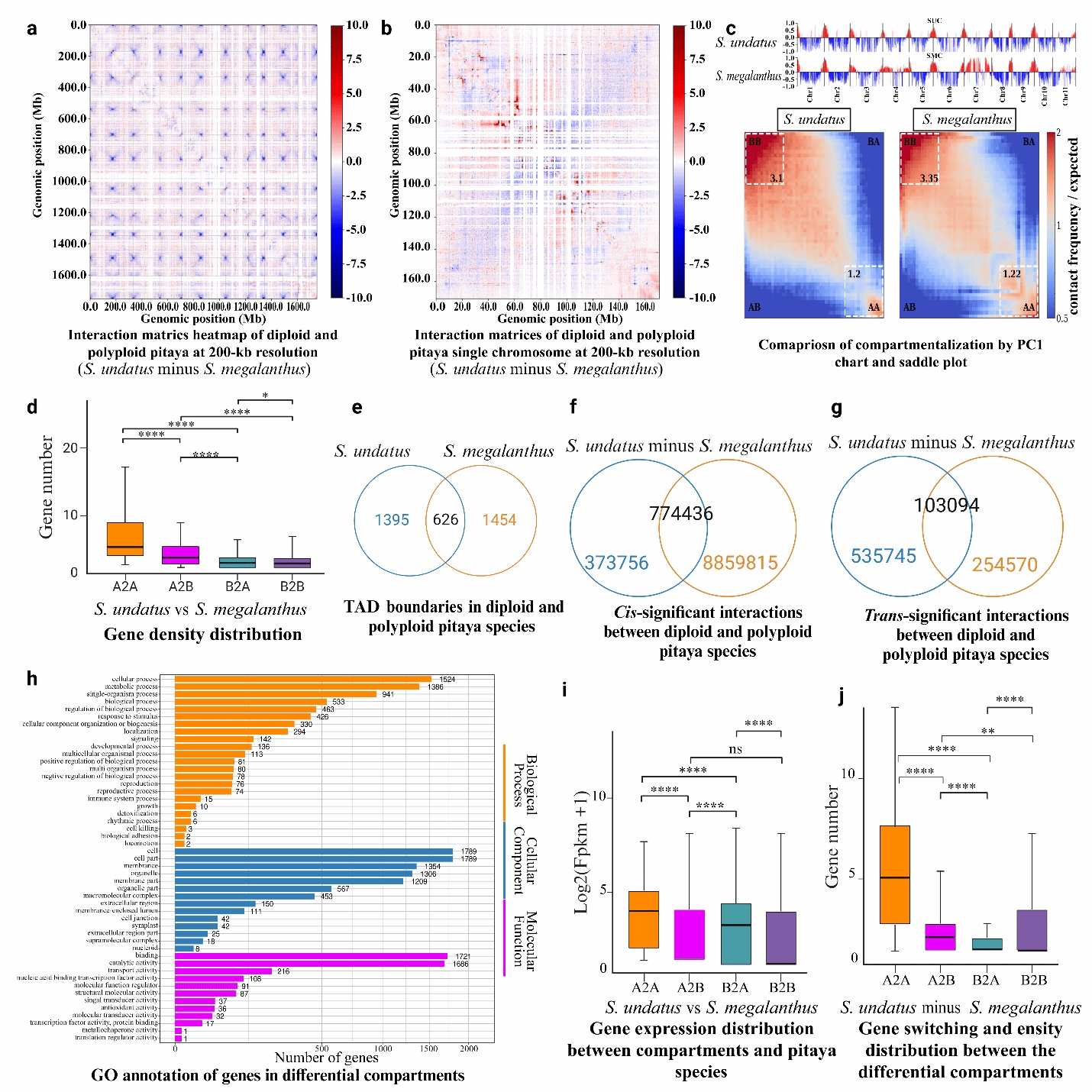 Hi-C互作分析表明,四倍体燕窝果中A-A和B-B区室间的相互作用更为强烈,同时呈现出独特的拓扑关联结构域(TAD)边界特征。研究者在四倍体燕窝果中鉴定出1,454个特异性TADs,在二倍体中则发现1,395个特异性TADs,表明两种倍性火龙果在三维基因组结构上存在显著差异(图4)。值得注意的是,哺乳动物的TADs形成依赖于特定的结构蛋白[1],而植物虽然缺乏这类蛋白,但其携带的TCP家族转录因子(如TEOSINTE BRANCHED 1、CYCLOIDEA和PCF1等)可能发挥着类似的功能[2]。