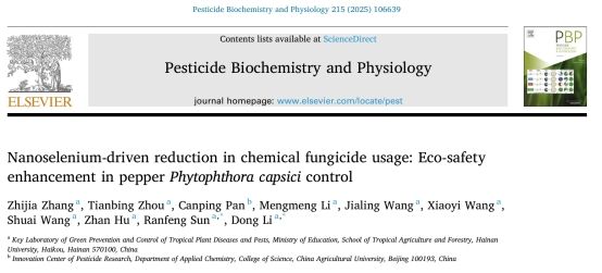 该成果以“Nanoselenium-driven reduction in chemical fungicide usage: Eco-safety enhancement in pepper Phytophthora capsici control”为题发表在Pesticide Biochemistry and Physiology期刊(中科院一区,IF=4.0)上,最靠谱的十大足球平台张芷嘉(2022级植物保护学硕,2025级作物学博士)为该论文第一作者,孙然锋教授、李栋副研究员为论文通讯作者。该论文得到中国农业大学潘灿平教授的指导建议。本研究得到了海南省自然科学基金(325QN229)的支持。