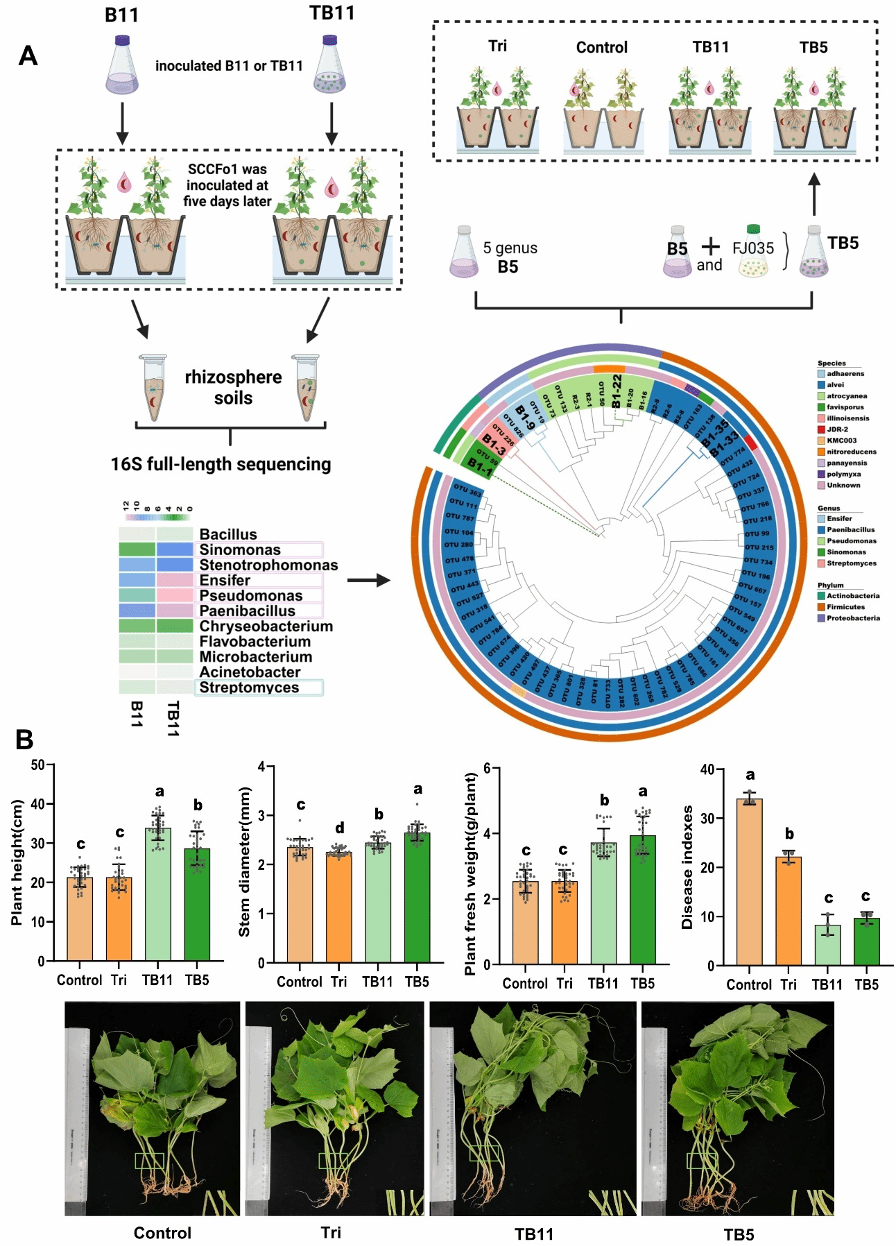 研究进一步将TB11简化为由FJ035与6株核心细菌(属于Streptomyces、Sinomonas、Ensifer、Pseudomonas和Paenibacillus)组成的简化菌群TB5。该简化菌群防效达71.43%,植株鲜重增加54.69%,表现出与TB11相近的防控与促生效果(图2)。