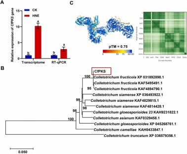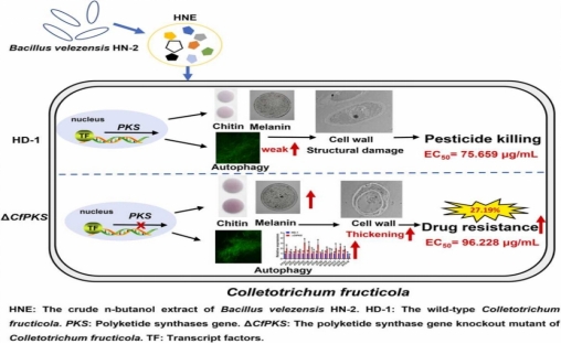 橡胶树炭疽病是制约天然橡胶产业的重大病害,其病原菌果生刺盘孢菌菌(Colletotrichum fructicola)的耐药性问题给田间防治带来严峻挑战。挖掘病原菌自身的耐药性调控关键因子,是开发高效生防策略的突破口。该研究从C. fructicola HD-1中鉴定出一个受生防菌贝莱斯芽孢杆菌HN-2粗提物(HNE)显著诱导的聚酮合酶基因CfPks。通过基因敲除和功能分析,团队发现CfPks基因的缺失不仅没有降低病原菌的耐药性,反而使其对HNE及多种化学杀菌剂的耐受性增强。深入机制解析表明,CfPks实际上是一个耐药性的负调控因子。其缺失触发了病原菌的“过度防御”反应,导致细胞壁几丁质异常沉积、黑色素大量积累以及自噬流过度激活。这种失调的应激反应虽然增强了菌体的结构稳定性,但也付出了孢子产量显著降低的适应性代价。该研究鉴定了一个关键的病原菌致病与适应性调控枢纽,为通过干扰病原菌自身稳态来增强生防效果的“以菌治菌”新策略提供了创新理论靶点。