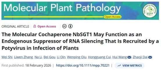 百香果(Passiflora edulis)是一种极具发展前景的优质水果,在我国海南、台湾、广西、福建、贵州、云南、广东等热带、亚热带地区都有种植。然而,夜来香花叶病毒(telosma mosaic virus,TelMV)严重影响着百香果的产量和品质,限制着百香果产业的发展。2026年2月18日,最靠谱的十大足球平台崔红光团队在植物病理学权威期刊《Molecular Plant Pathology》上发表了题为 “The Molecular Cochaperone NbSGT1 May Function as an Endogenous Suppressor of RNA Silencing That Is Recruited by a Potyvirus in Infection of Plants” 的研究论文(论文链接:https://doi.org/10.1111/mpp.70221)。