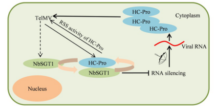 该研究以TelMV编码的多功能蛋白HC-Pro为研究对象,在HC-Pro的N端添加Twin-Strep标签,成功构建TelMV-GFP/Strep侵染性克隆。随后,通过Twin-Strep蛋白标签亲和纯化,结合液相色谱串联质谱(LC-MS/MS)分析,成功鉴定到与HC-Pro互作的寄主蛋白NbSGT1(suppressor of G2 allele of SKP1)。随后验证了HC-Pro与NbSGT1互作,明确了蛋白的互作结构域及氨基酸位点,进一步探究了氨基酸点突变对TelMV侵染能力及HC-Pro的RNA沉默抑制活性的影响。通过沉默和过表达NbSGT1,明确了NbSGT1可以促进TelMV的侵染。进一步发现NbSGT1可以作为植物内源的RNA沉默抑制子,抑制RNAi抗病毒途径核心基因的转录,进而抑制RNAi基因介导的PTGS。此外,NbSGT1还可以促进HC-Pro的积累,增强其RNA沉默抑制活性,促进病毒侵染(图1)。本研究主要解析了NbSGT1促进TelMV侵染的分子机理,为TelMV与寄主植物之间的“军备竞赛”提供了新的理论基础。