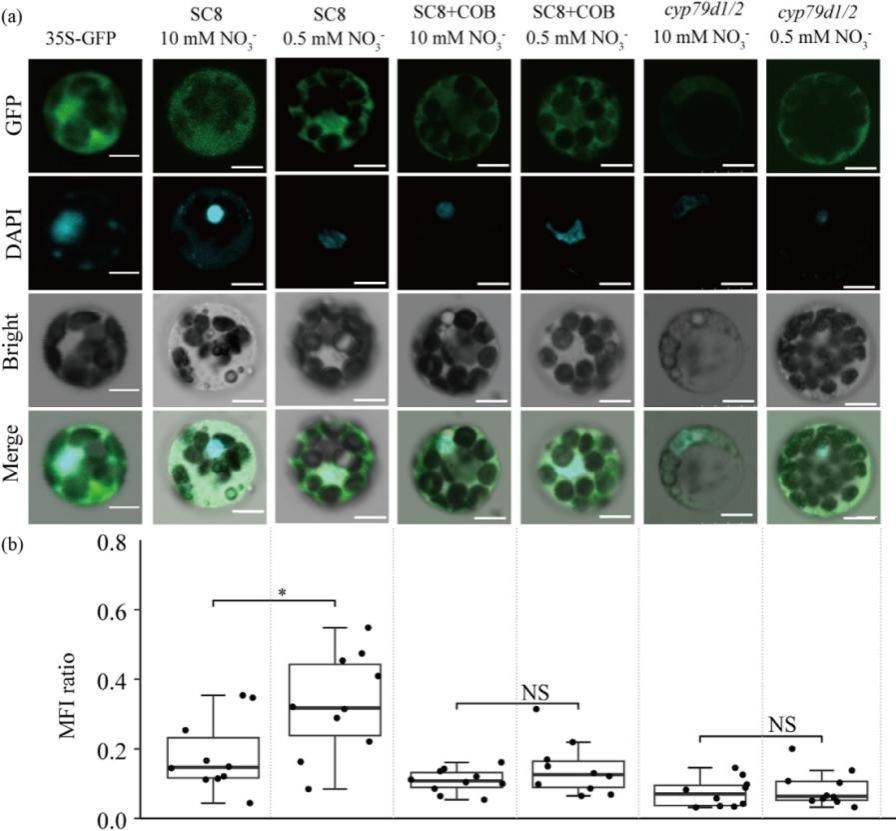 图2. 不同 NO3 -和 COB 处理下 MeHNL11 在木薯原生质体的亚细胞定位分布