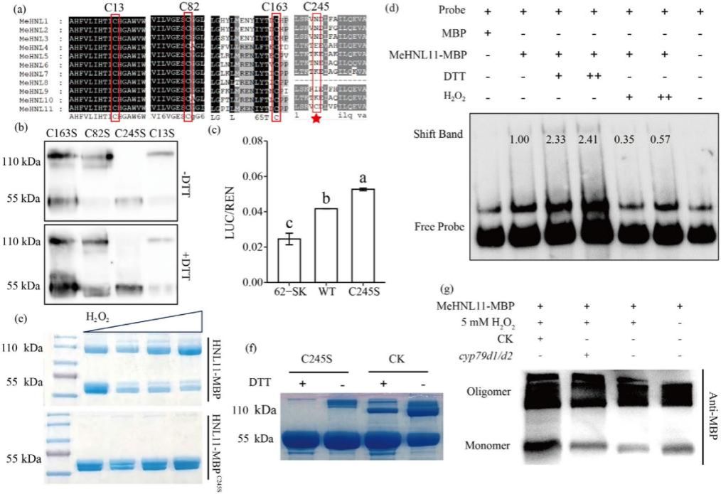 研究团队通过RNA-seq分析发现,低氮胁迫显著诱导氰化物同化基因 MeCAS1b 在木薯须根中上调表达,且该过程依赖于内源氰化物的产生。生理学实验证实,阻断氰化物同化途径会严重削弱木薯的低氮适应性(图1)。为解析上游调控机制,作者以MeCAS1b启动子为诱饵进行酵母单杂交筛库,筛选到一个羟腈裂解酶家族成员MeHNL11。亚细胞定位表明,MeHNL11在低氮胁迫下可向细胞核富集并且其核质分布也与内源氰化物水平密切相关(图2)。Y1H、ChIP-qPCR、EMSA实验证实MeHNL11能直接结合MeCAS1b启动子上的S2片段(-612 bp至-576 bp),同时LUC实验证实MeHNL11正调控MeCAS1b的转录(图3)。进一步研究发现,MeHNL11通过第245位半胱氨酸(Cys245)形成二硫键依赖的同源二聚体/寡聚体;内源氰化物可促进其由二聚体向单体转化,而单体形式的MeHNL11具有更强的DNA结合能力和转录激活活性(图4)。