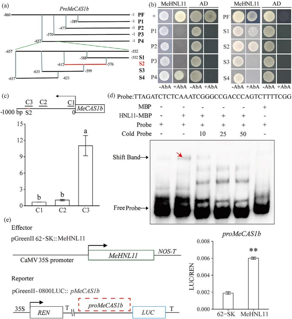 图3. MeHNL11结合MeCAS1b启动子并激活其转录活性