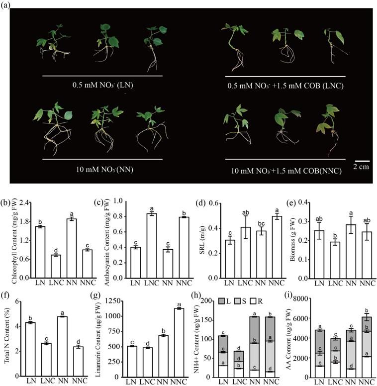 图1. 不同 NO3 -以及 COB 处理后的木薯表型分析