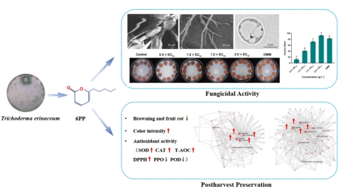 该研究自2019年开始从海南省9个市县的荔枝园中采集荔枝根际土壤311份,分离获得300株木霉,从中筛选出8株对荔枝霜疫霉菌丝生长抑制率达80%的菌株,其中猬木霉LS019-2的挥发性物质的抑菌作用最强,达到95.11%,采用固相微萃取和气质联用的方法,检测到6-戊基-2H-吡喃-2-酮(6PP)的含量最大,且6PP显著抑制荔枝霜疫霉菌丝生长、孢子囊萌发、严重破坏菌丝体的超微结构,阻碣病害的发展;在保鲜过程中能保持较好的果皮色泽、增强抗氧化物酶活性、富集氨基酸、减缓失重,从而延长了荔枝的货架期;这些结果表明,6PP可能是一种有效的防治荔枝霜疫病的天然产物,也是一种新的荔枝果实防腐保鲜剂。