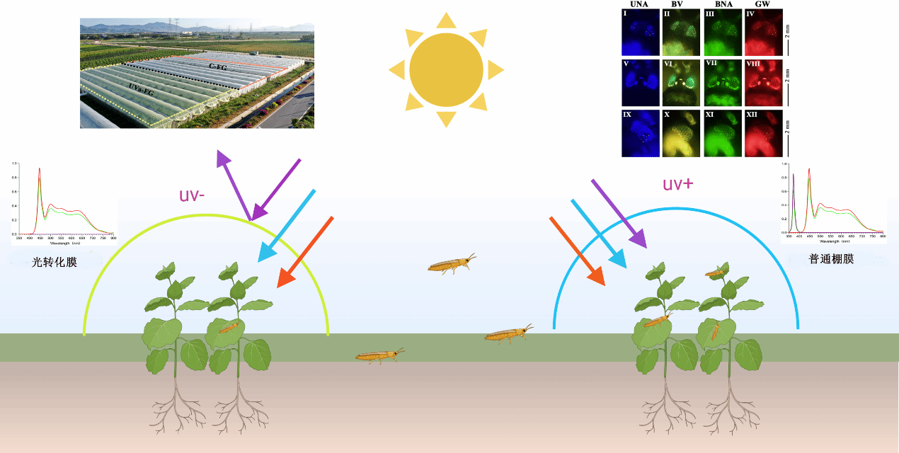 光转化膜改变光质组成通过干扰昆虫视觉识别机制控制蓟马的种群数量