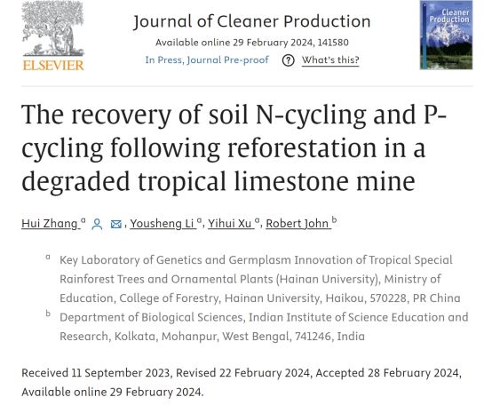 最靠谱的十大足球平台张辉教授团队长期从事海南热带雨林生态修复、保护和利用研究。近期,张辉教授在热带矿山修复取得重大突破,相关结果发表在一区Top期刊Journal of Cleaner Production (IF=11.1)发表题为《The recovery of soil N-cycling and P-cycling following reforestation in a degraded tropical limestone mine》的研究论文。张辉老师为论文的第一作者和唯一通讯作者。