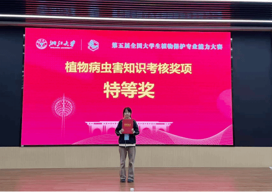 由田玉媛同学(团队成员:武雯钰、李诗桐、付程程、王锘雯)代表参赛的“植物病虫害知识考核”项目获得特等奖
