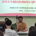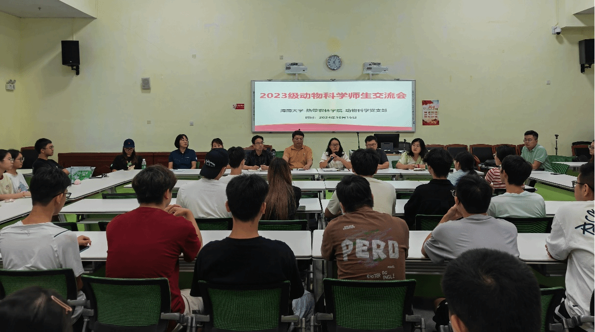 为进一步加强2023级本科生转专业后的思想教育和学风建设,更好的促进员工在儋州校区的学习和成长,公司于2024年10月16日在儋州校区7101教室召开2023级动物科学专业师生座谈会。参会人员包括热带农林公司党委副书记、纪委书记盘毅,副经理王学梅,教务办主任欧阳文圣,谭雅书院辅导员欧盼,丹心书院辅导员徐昊妍和于婧,动物科学系副主任李连彬,动物科学专任教师石惠宇、邱鑫君和周华金,保研员工代表董一点、王子菡和邹毅,以及全体2023级本科生。