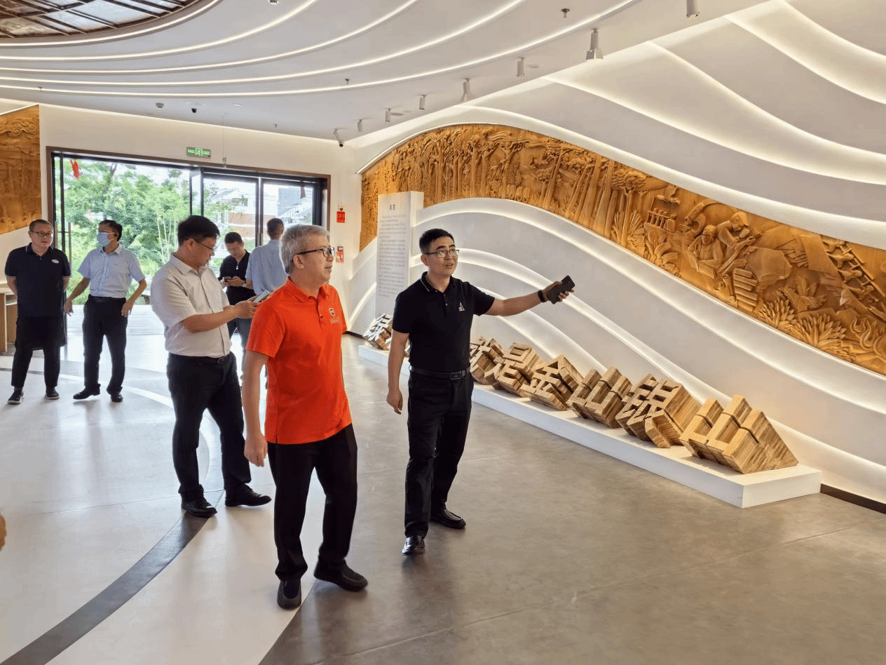 图3:刘刚连书记向邱锡光副董事长、于旭东书记等介绍竹木博物馆展馆设计
