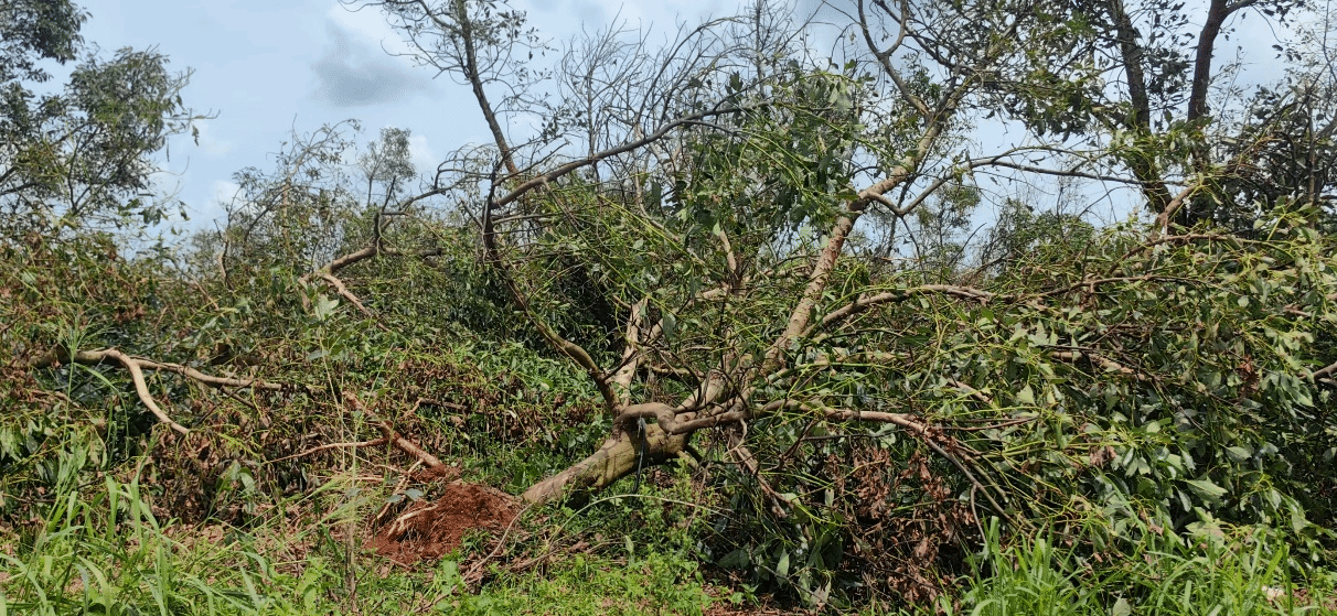 在澄迈县福山镇保良村,根据果园牛油果的倒伏情况,林江老师建议,对已经发生折断的树体,采取清除处理;对仅发生倒伏,没有发生折断的树体,可将枝干进行修剪处理后,做扶正和加固处理,尽量避免发生二次倒伏。完成病残枝处理后,及时开展一次全园消毒处理工作,避免台风损失和修剪的伤口发生侵染。